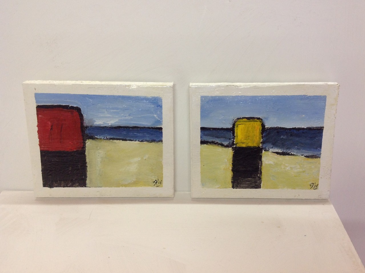 Zeebrokken met strandpalen. 20 x 25 x 2 cm. VERKOCHT.