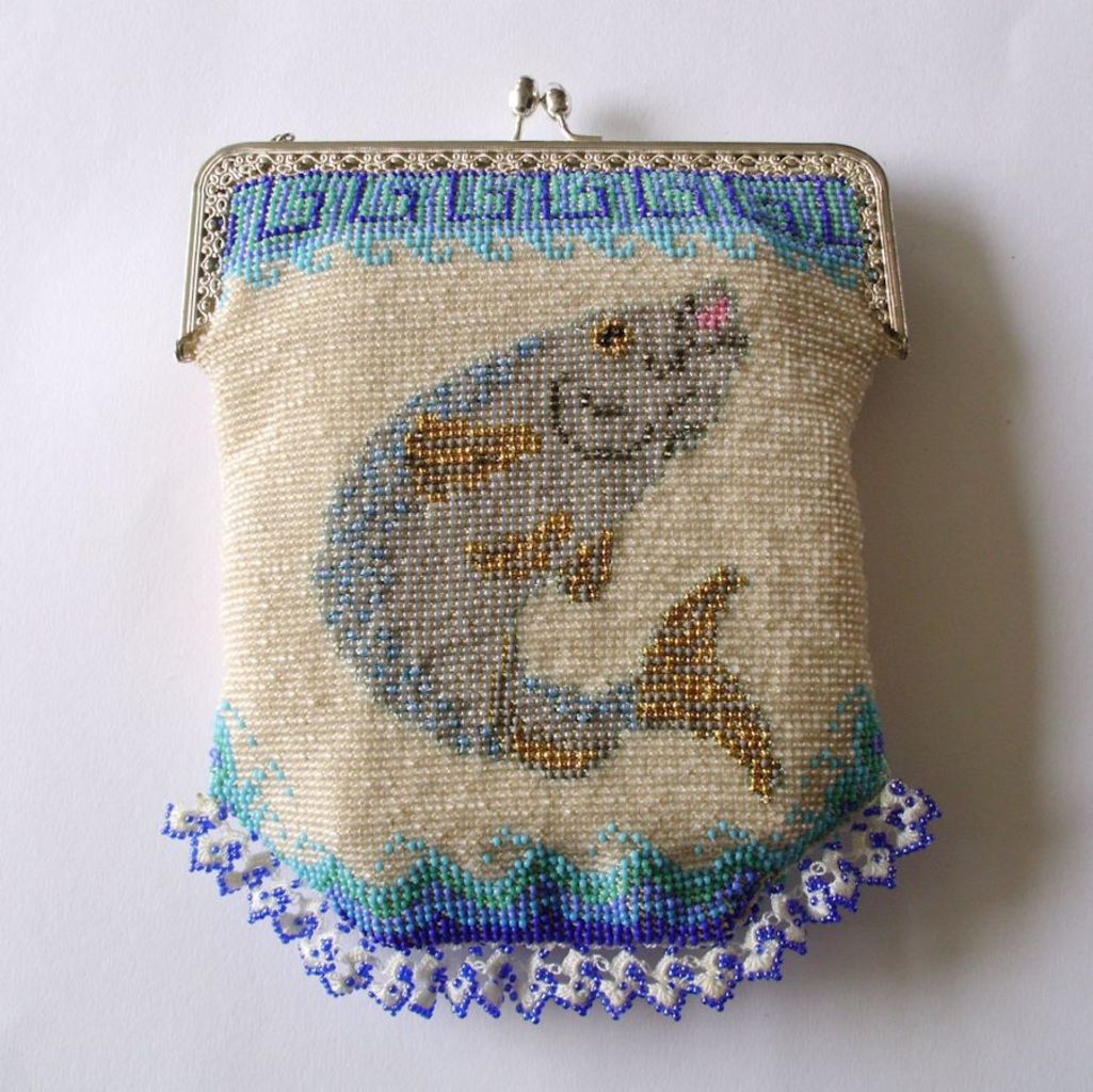 Gebreide kralentas met een forel, de tas is gevoerd van binnen en echt te gebruiken, de beugel heeft een ketting maar die is voor de foto naar achteren gestopt.