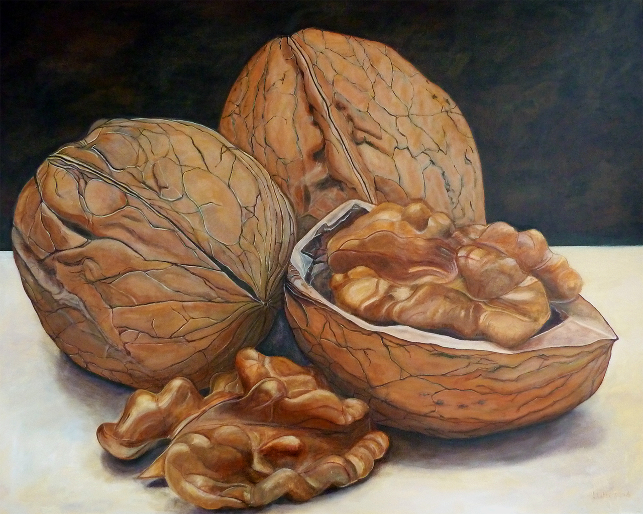 Walnoten Stilleven Realistisch Walnuts Stilllife Realistic Oker Ochre Bruinpaars Brownpurple Colourcontrast Kleurcontrast