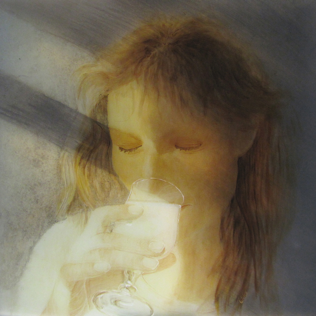 Genieten met alle zintuigen van het leven. Vol overgave, vol vertrouwen. Heerlijk. Transparante acrylschildering op gehard glas, met op maat gemaakt lichtpaneel dat door de transparante verflagen schijnt.