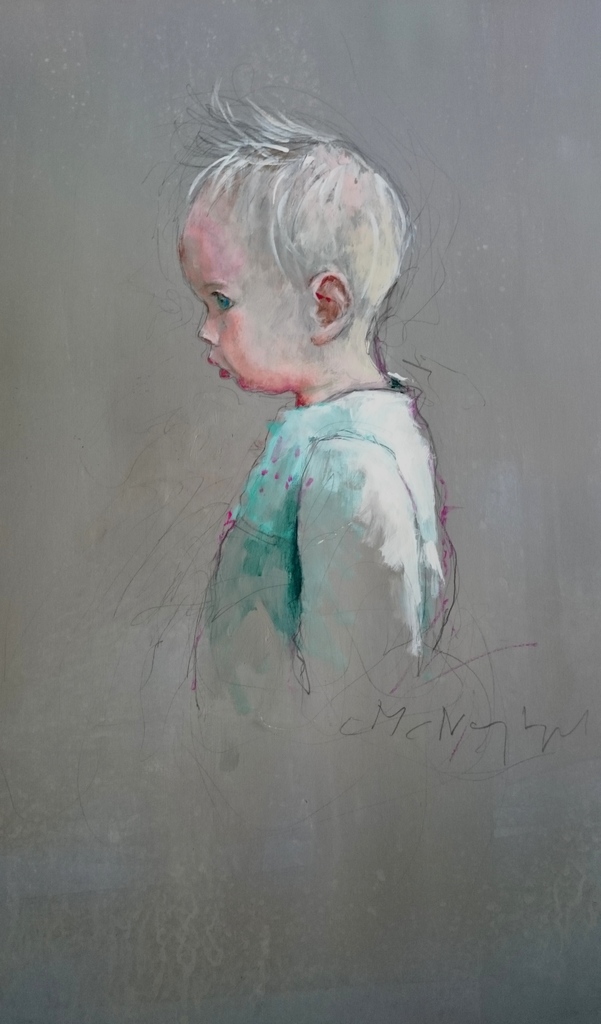 Portret van een klein kindje, ze was net uit bed en nog niet helemaal wakker.In opdracht acryl en olieverf op doek 50-65 ,550,-
