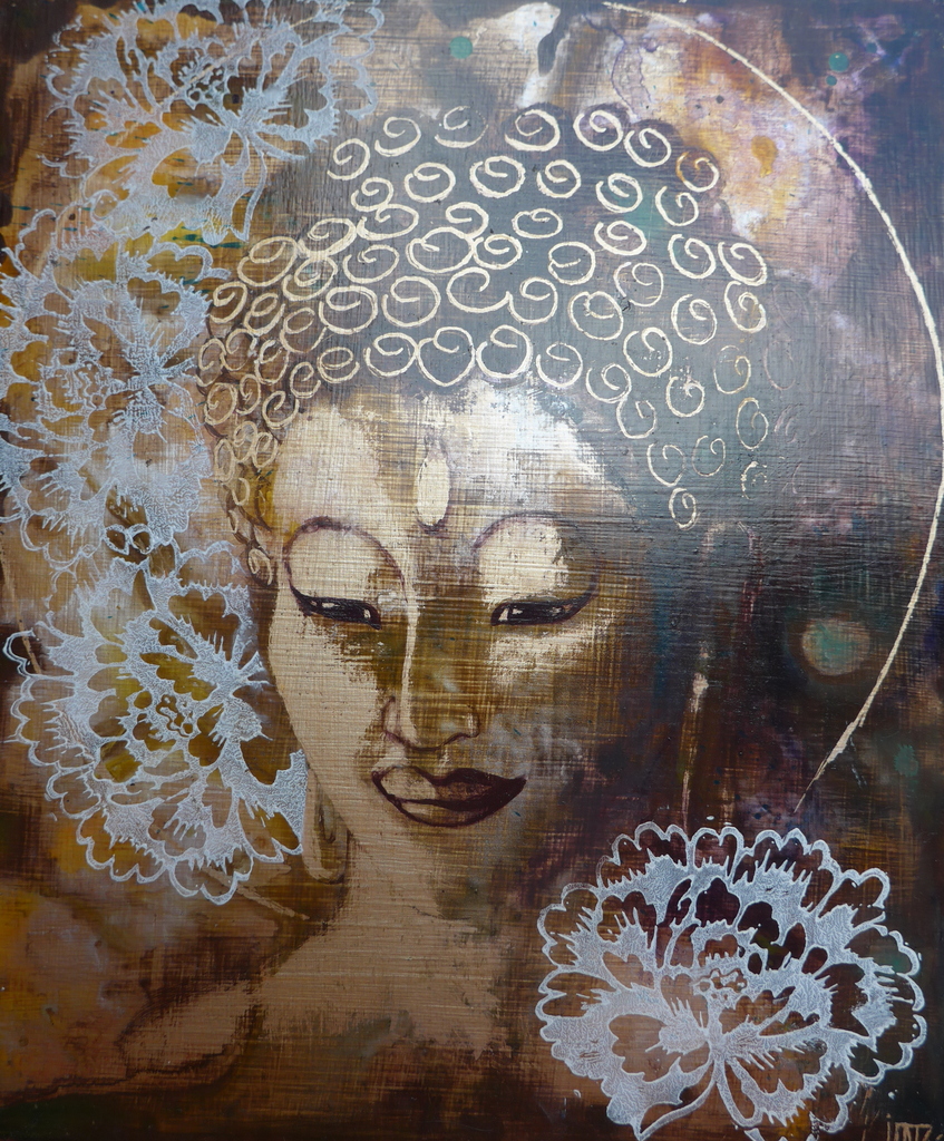 Vrouwelijke Boeddha, bruin op goud (0.6)