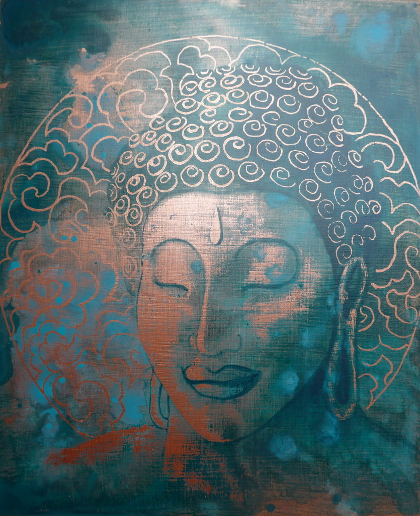 Groene Boeddha op koperkleurige ondergrond (0.7)