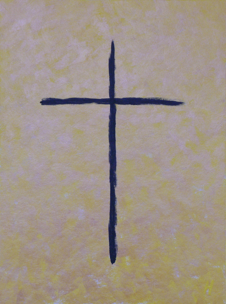 De goudverf staat voor de glorie van God. De kruisiging van Jezus was nodig zodat wij deel konden hebben aan deze glorie. Een zwart kruis als een herrinnering hieraan: de duisternis die Jezus moest ondergaan zodat wij in het licht konden komen.