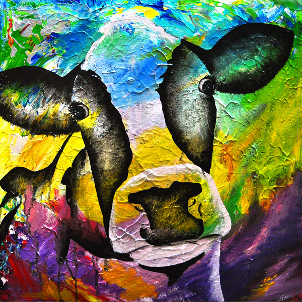 VERKOCHT. Kleurrijk koeienschilderij. Achtergrond acrylverf en de koe in olieverf. 50x50x4cm.