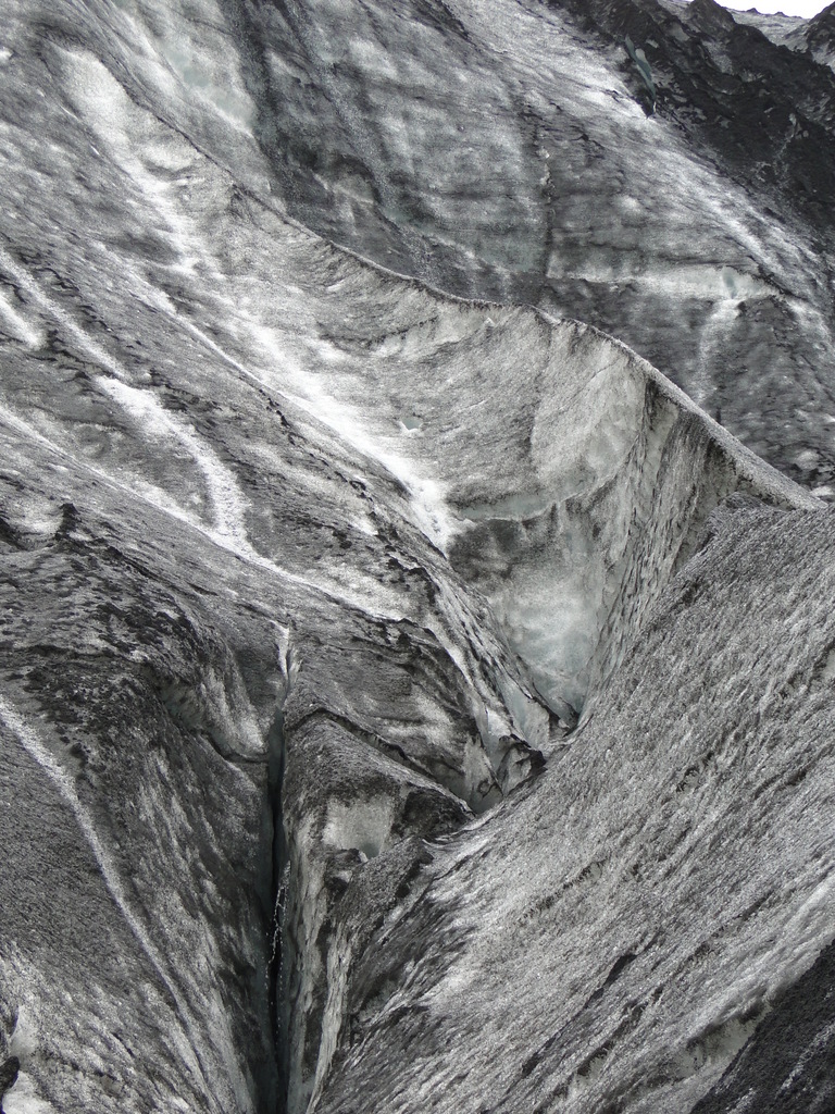Spleet in de gletscher Sólheimajökull in het zuiden van IJsland. De gletscher is bedekt met het as van de Katla-vulkaan die in 1918 voor het laatst is uitgebarsten. Afgedrukt op geborsteld aluminium dibond waardoor de witte delen niet geprint zijn en de kleur van het aluminium te zien is. Oplage: max. 5 stuks. Andere afmetingen mogelijk.