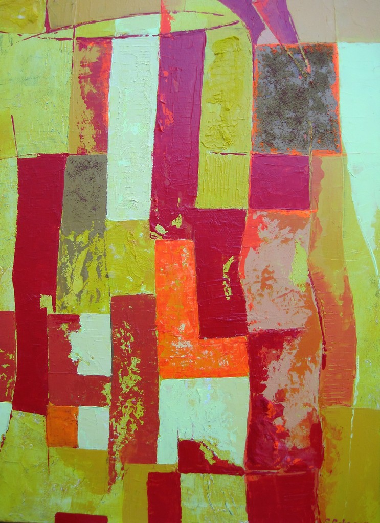 Schilderen met acryl en paletmes. Meeste schilderijen ontstaan vanuit innerlijk beeld, indruk of tekst.