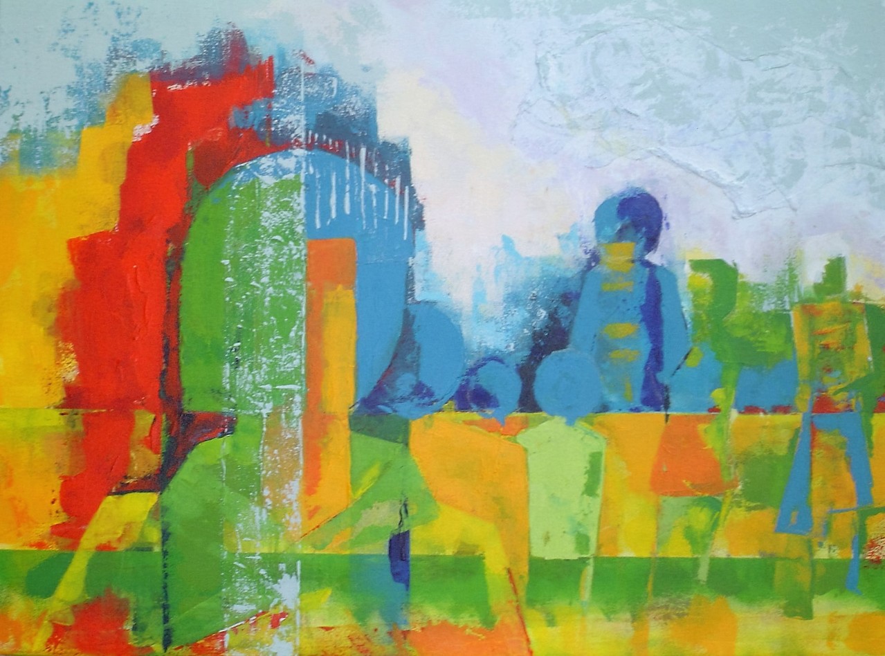 Schilderen met acryl en paletmes. Meeste schilderijen ontstaan vanuit innerlijk beeld, indruk of tekst.