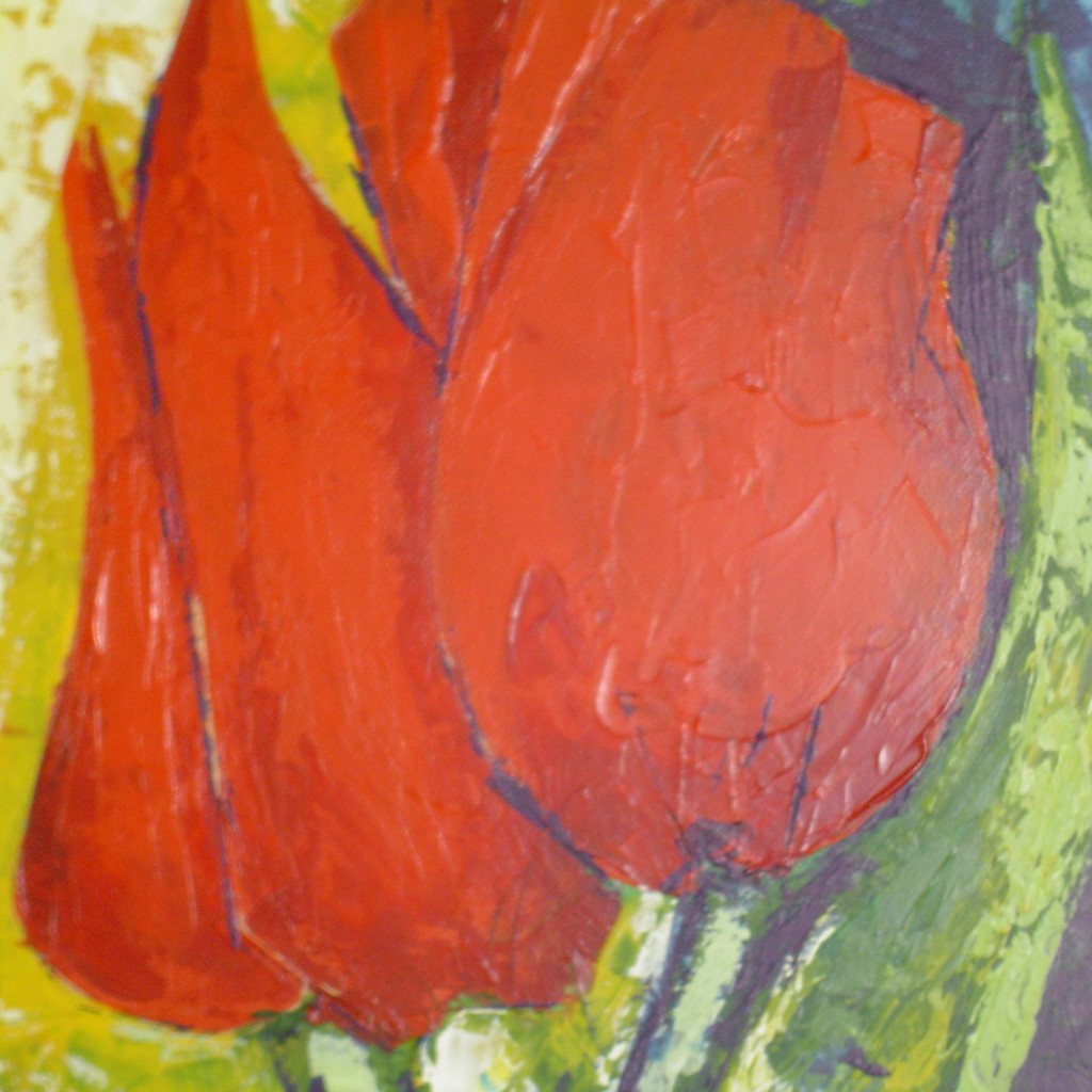 Schilderen met acryl en paletmes. Meeste schilderijen ontstaan vanuit innerlijk beeld, indruk of tekst.