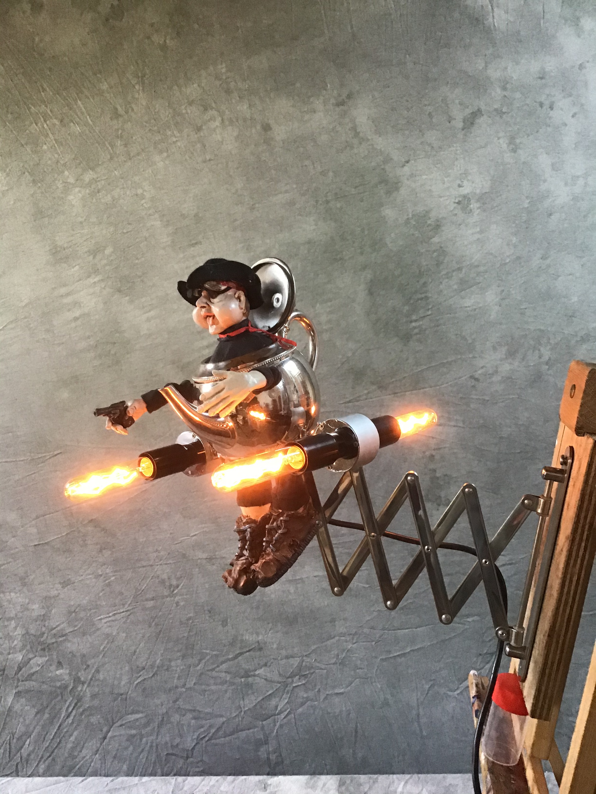 Lampen gemaakt van spullen die ik heb gevonden op straat of gekocht op rommelmarkten. Deze kan gemonteerd worden aan de muur, voor bijvoorbeeld als bedlampje of als decorlamp in de huiskamer. Unica!