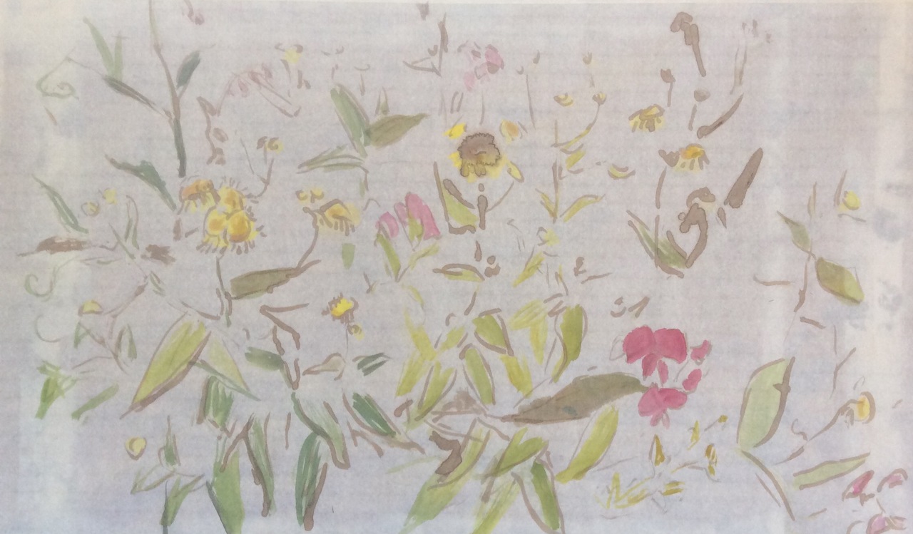 Schildering op Japans papier van bloemen in een border