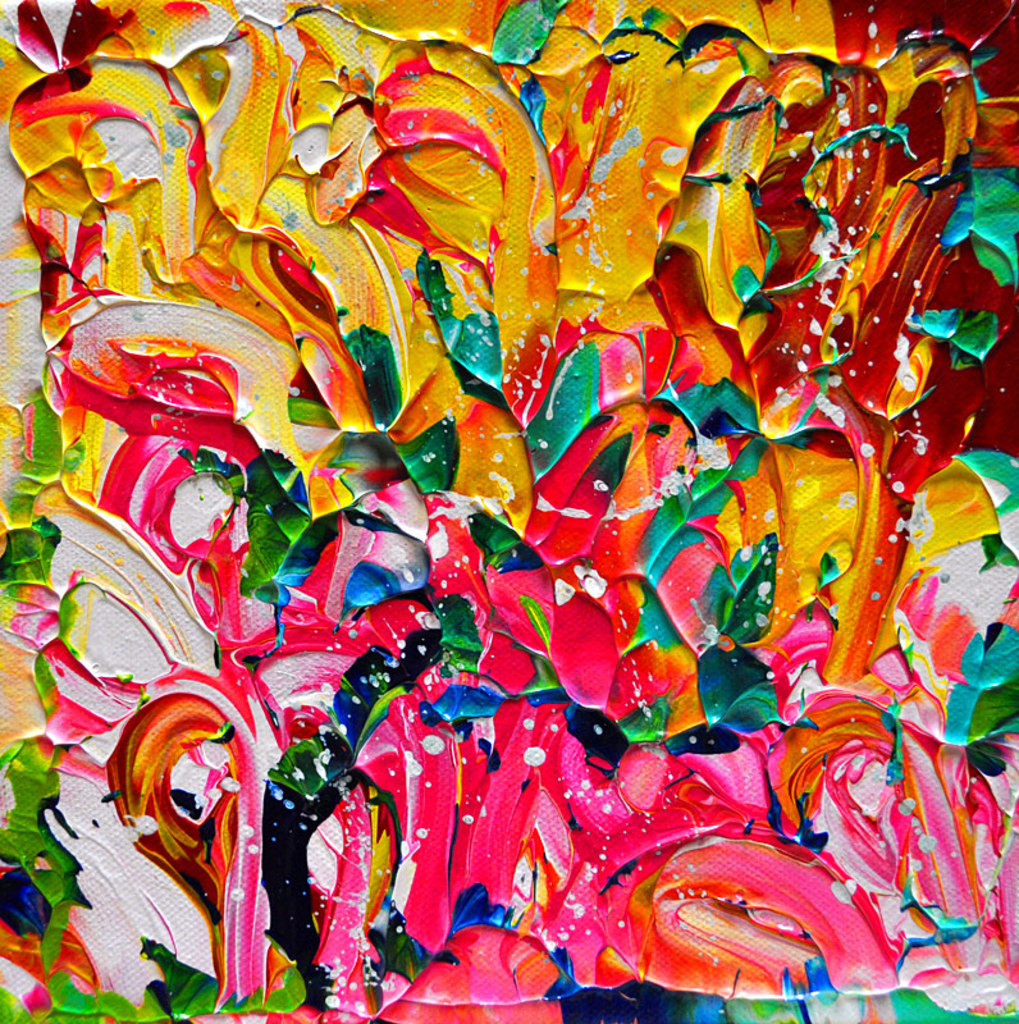 VERKOCHT. Kleurrijk abstract schilderij, 20x20cm.
