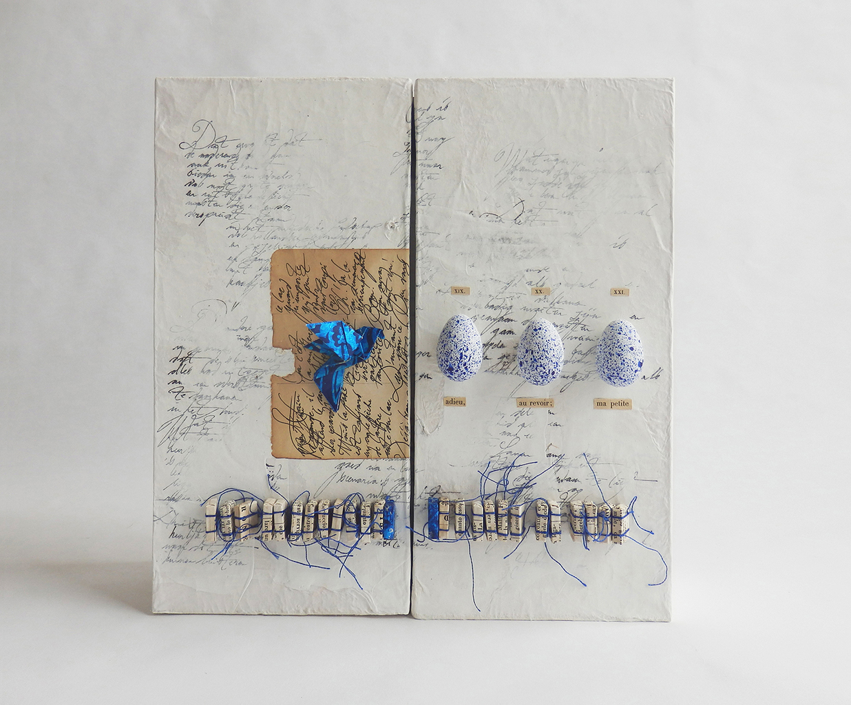 Doos met witte, bescheven achtergrond met romantische collage waarbij de sfeer bepaald wordt door het kleurgebruik en de diverse elementen zoals het stuk oude brief, de blauwe duif en de bespikkelde eitjes. Het uitvliegen en thuiskomen. Ieder in zijn eigen huis. Eronder in horizontale lijn de verbeelding van kennis en literatuur, bij elkaar gehouden met blauw garen. Het boek wat hierbij hoort heeft een bewerkt omslag met grof beschilderd papier en kaasdoek. Het is jammer dat er maar 1 foto te zien is want de doos heeft een hele sfeervolle binnenbekleding en er ligt een uniek, handgemaakt boek in waarvan de pagina's op een speciale manier bewerkt zijn. Als je geïnteresseerd bent, laat een berichtje achter en ik stuur je meer beeldmateriaal toe van dit boek!