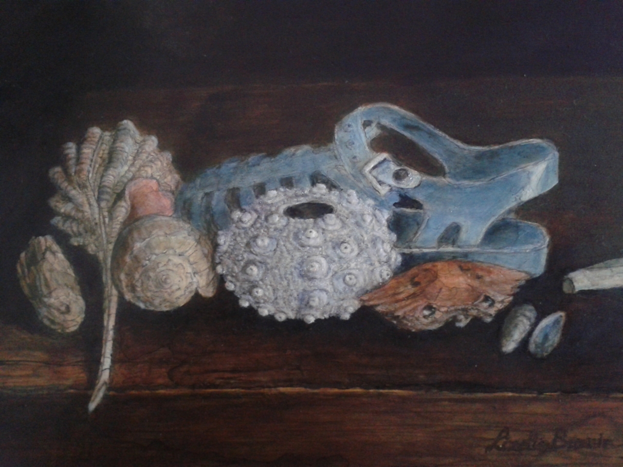 Oilpaint Stilleven Beach Still Life Schelpen And Sea Found Lost Shoe Objects Twigs Shells Orchin Crabschaal