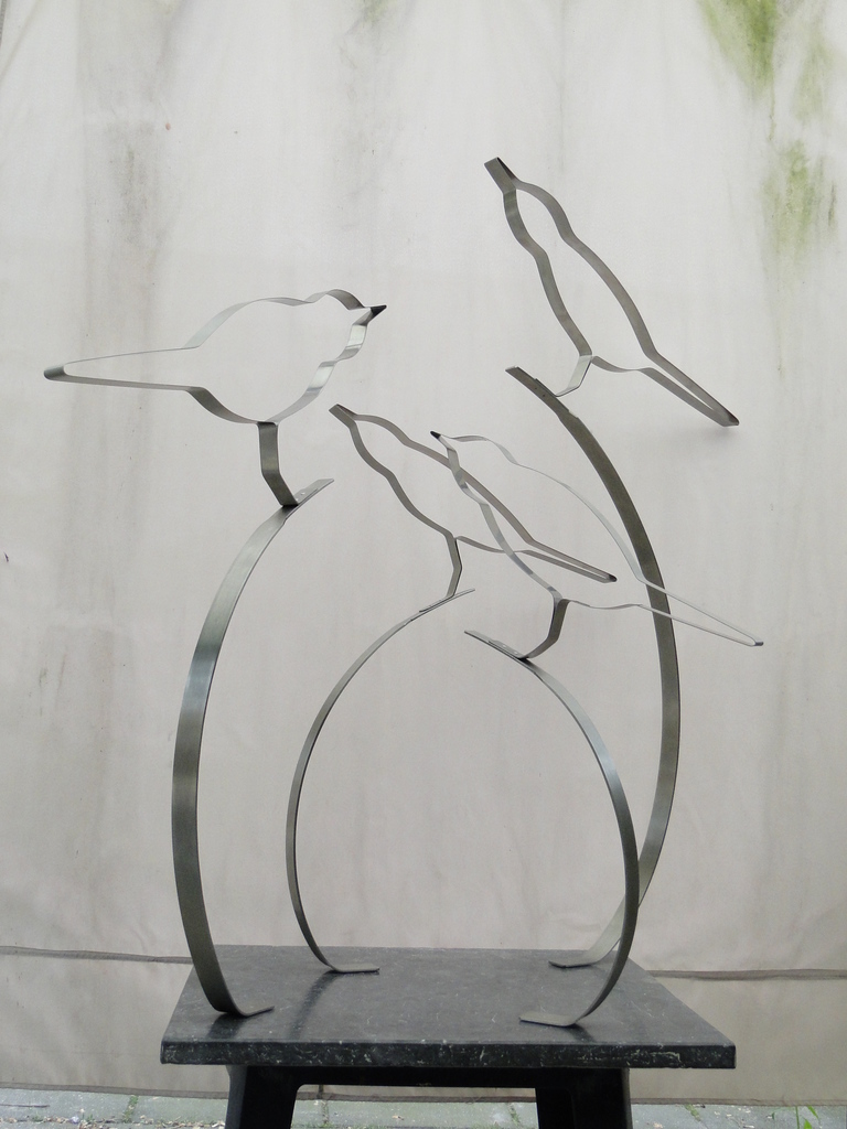 Dit kunstwerk is in opdracht gemaakt voor een gezin met 2 kinderen. De vogels zijn met klinknagels op de RVS stang gemonteerd. Het geheel is vastgezet op een hardstenen plaat van 80 x 70 cm