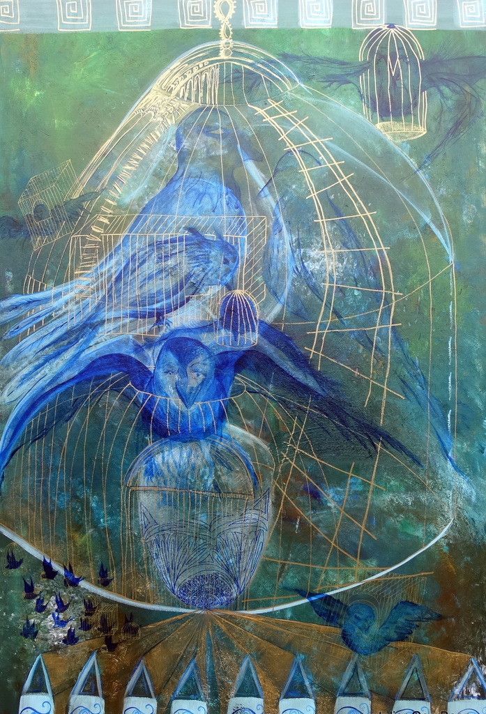 Schilderij Blauw Blue Birds Vogels Kooi Transformatie Gea Cage Boon Transformation