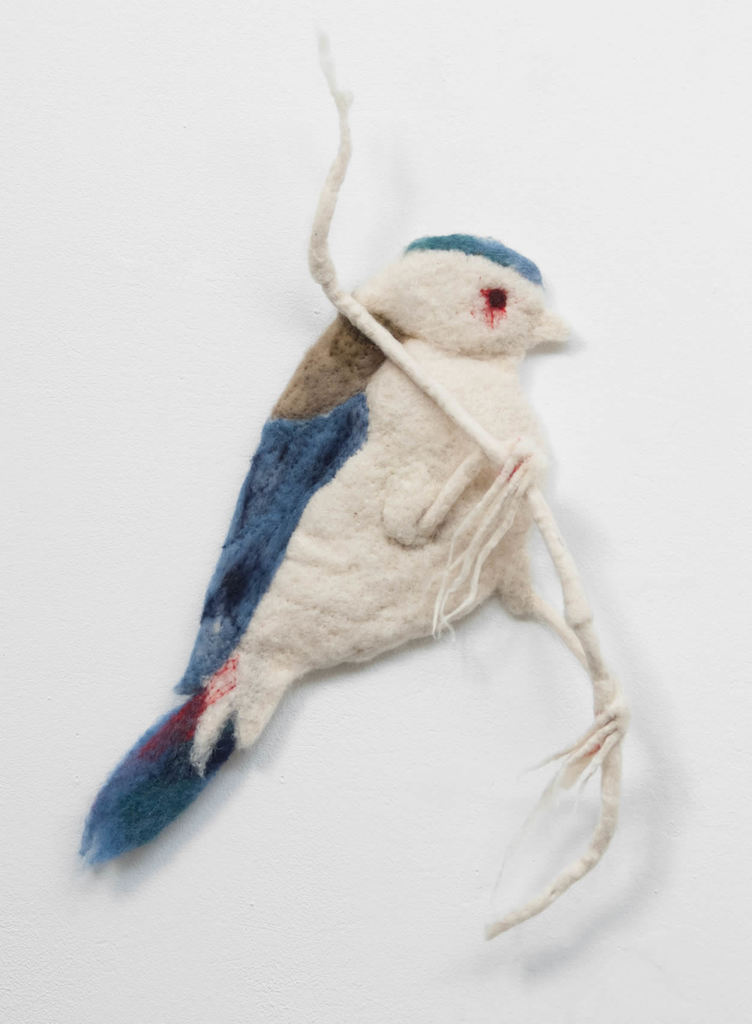 Werken van wol en acrylhars. Zowel zacht en aaibaar als confronterend.