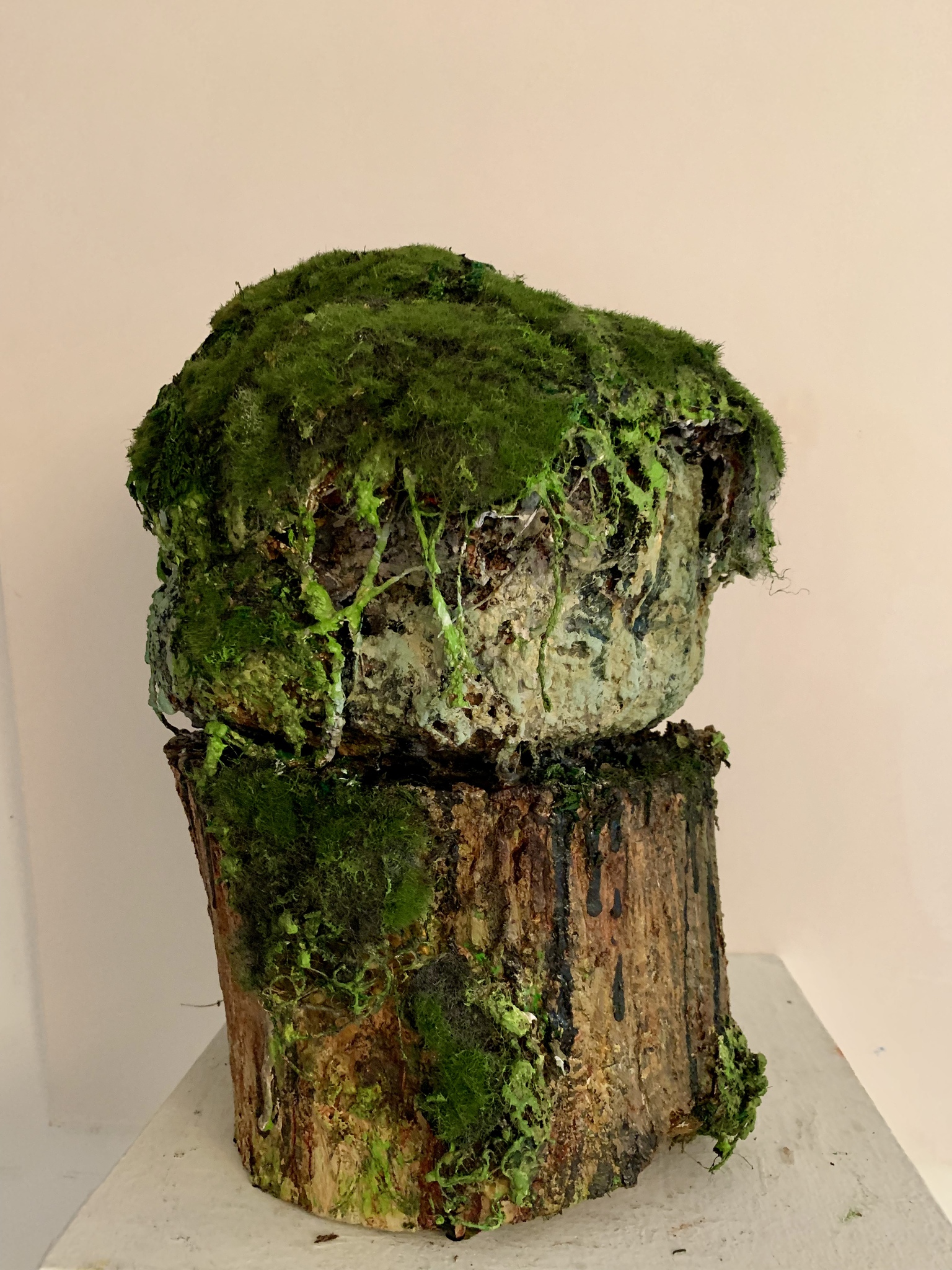 Hier heb ik een Bemoste Steen gemaakt op een kleine boomstam. De steen (keramiek en gemengde techniek) kan dus geopend worden en heeft ruimte om een dierbare herinnering te bewaren . ( as en/of iets anders )
