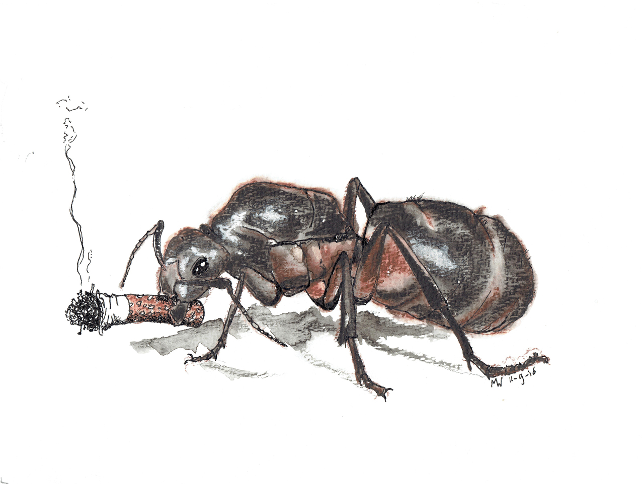 Gewone Reuzenmier pakt het roken op: oostindische inkt, aquarelpotlood en conté op aquarelpapier.