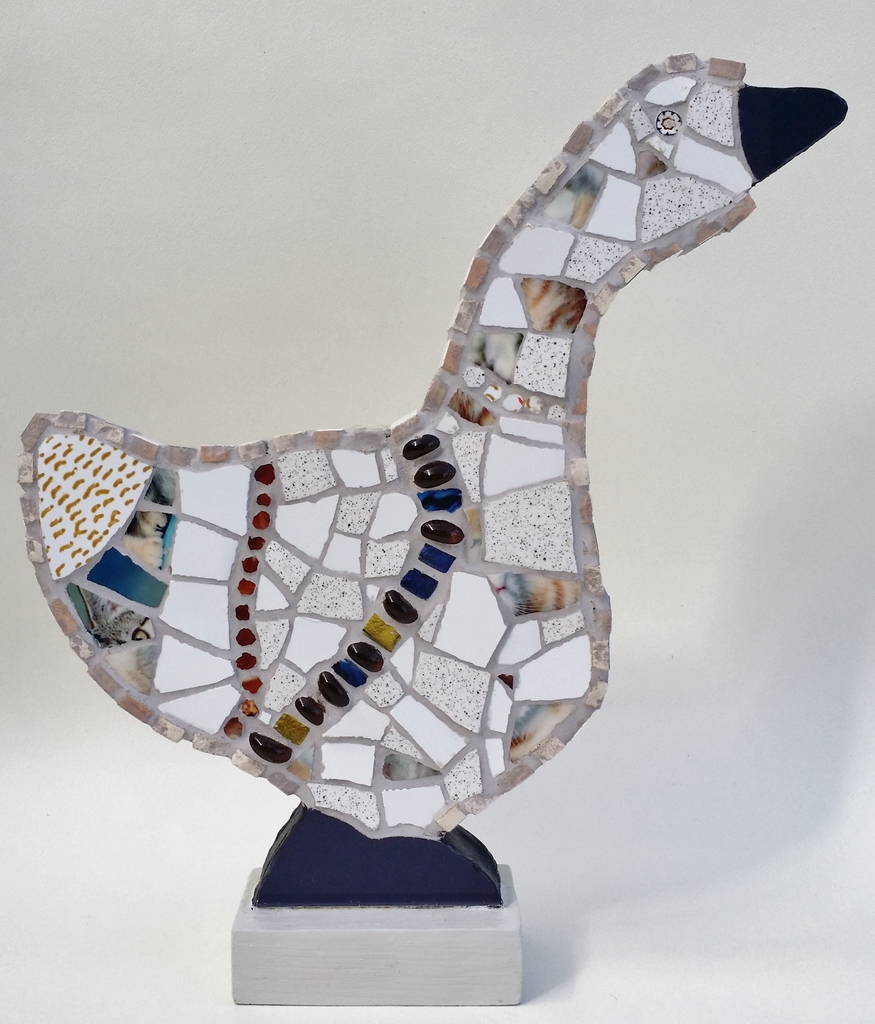 Een gans van hout met een nieuw kleurrijk uiterlijk van steen- en glas mozaiek. Is staand te gebruiken en aan zowel voor- en achterkant voorzien van mozaiek.