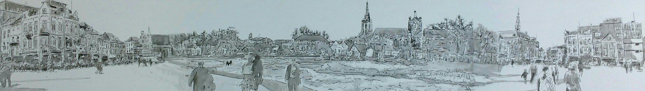 Skyline 's-Hertogenbosch, Sint jan, Bossche Broek, markt, VVV, stadhuis, cafe, etc. Getekend en geschilderd met pen en Oost-Indische inkt op paneel 29x190 cm.