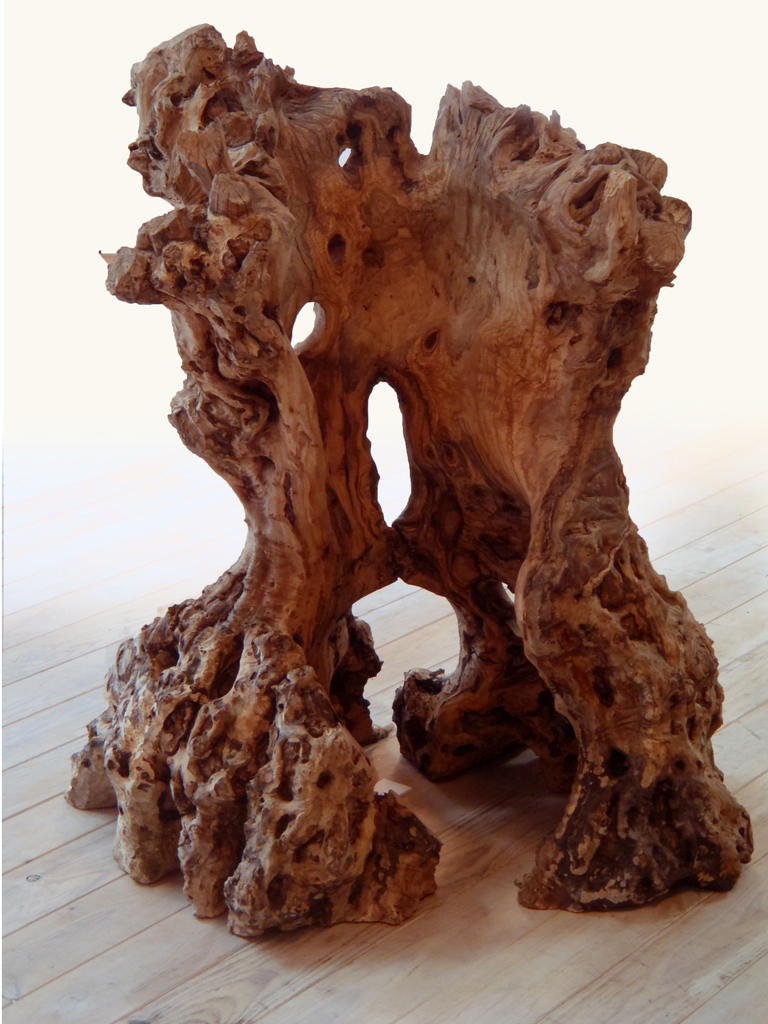 Sculptuur gemaakt uit een oude olijfboom. Aan de buitenzijde de oorspronkelijke vormen van het hout behouden, verder is de sculptuur helemaal opengewerkt en gevormd. Afgewerkt met olie.
