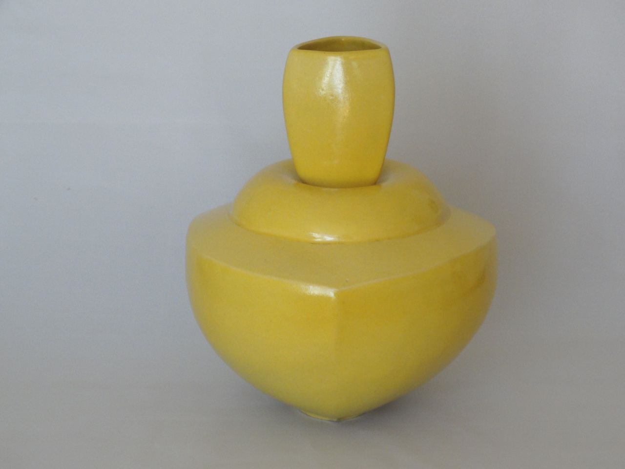 Samengestelde vaasvorm met de hand opgebouwd. Geel geglazuurd aardewerk.