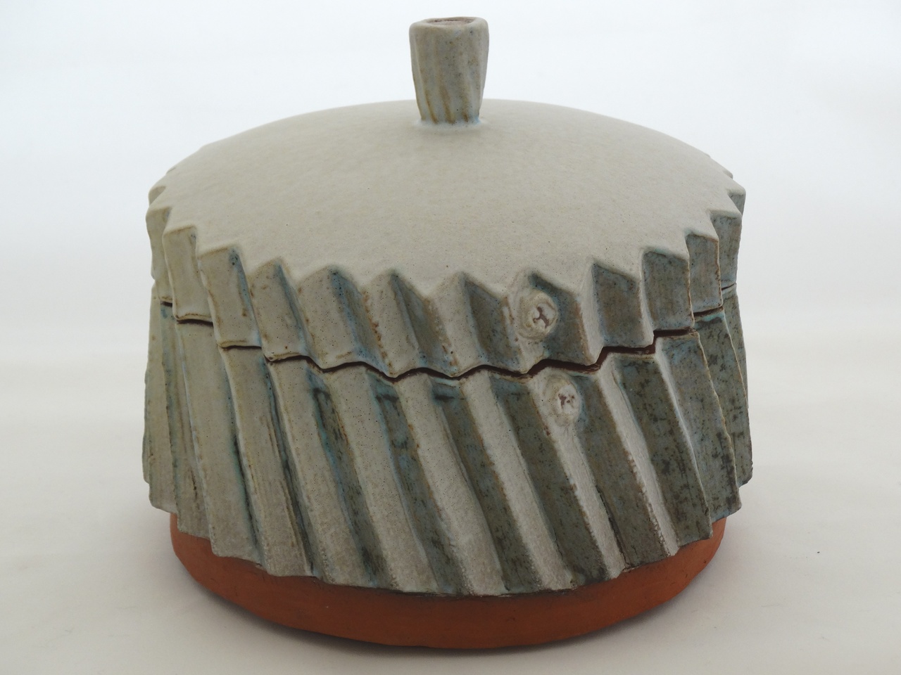 Dekseldoos, geplooid. Roodbakkend aardewerk. Oxides en mat wit glazuur.