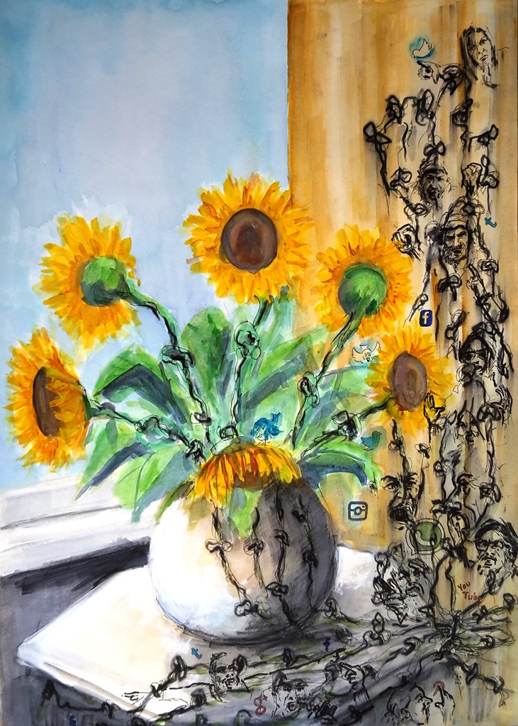 STIL-LEVEN ...doorleef de knopen in het leven ...tot verdere bloei. (schelden helpt niet) Waterverf op (behang) papier