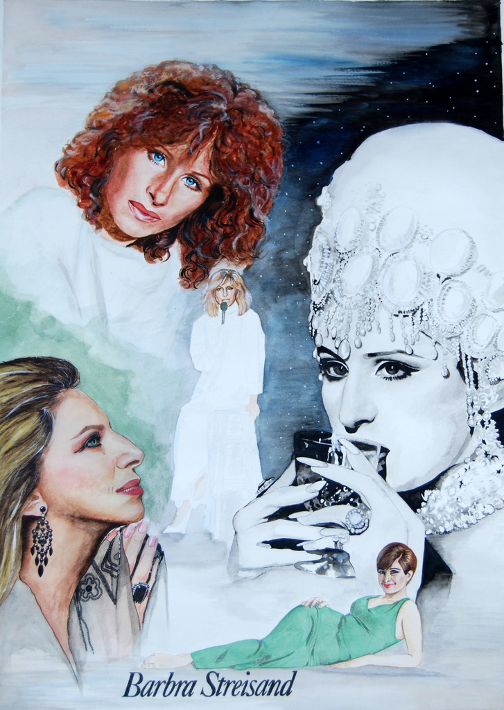 Verschillende gezichten van Barbra Streisand , ster uit films en de vele platen / CDs die ze maakte. Dit werk dateert van 1992