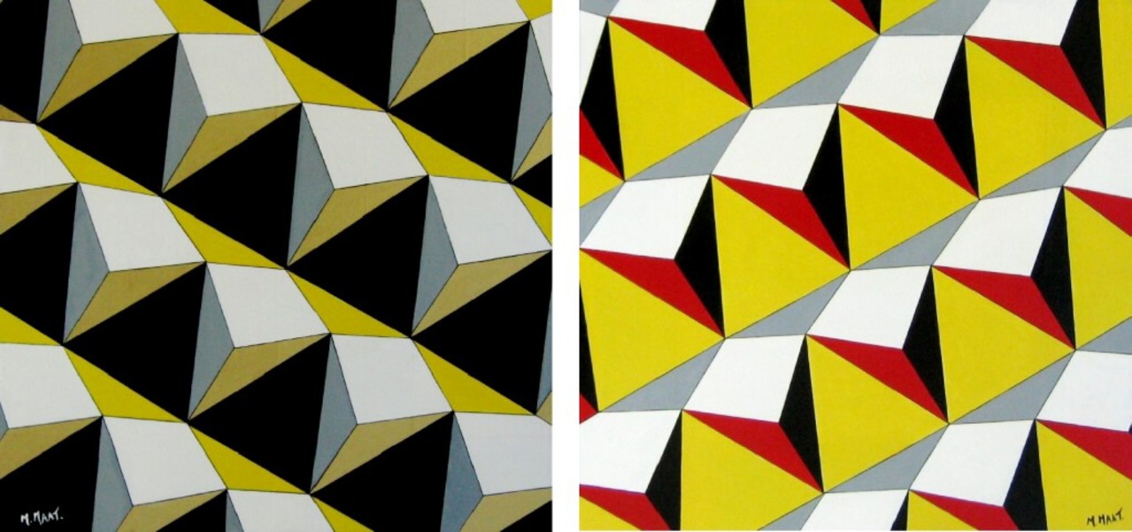 Tweeluik: Piramiden diagonaal in spiegelbeeld en kleurcontrast. Dit tweeluik speelt met de waarneming. Kijk je van bovenaf op de piramide of kijk je tegen de voorkant van de piramide? Wat is het optisch effect?
