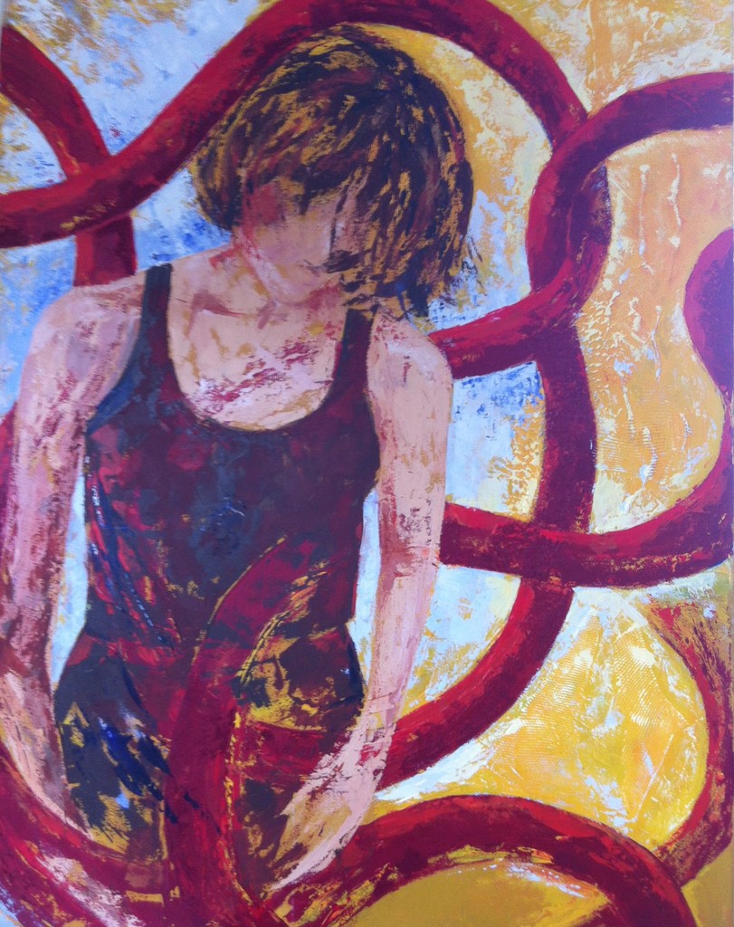 Schilderen met acryl en paletmes. Meeste schilderijen ontstaan vanuit innerlijk beeld, indruk of tekst.