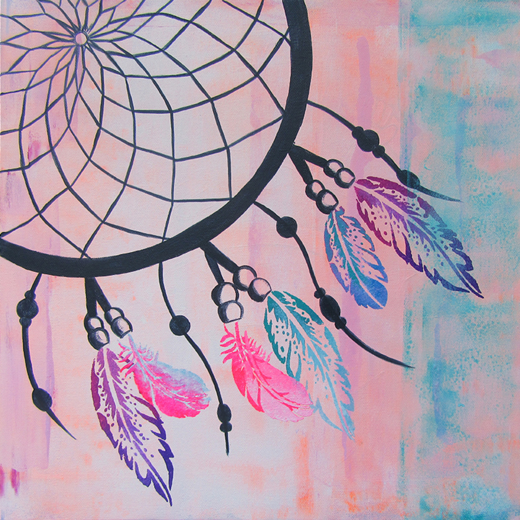 Stoer schilderij voor op de tienerkamer van een dromenvanger. Het schilderij is handgeschilderd met acrylverf en bewerkt met graffiti.