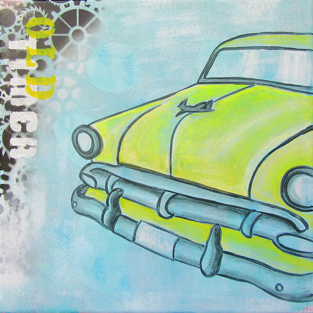 Stoer auto schilderij voor de jongenskamer van een gele oldtimer. Het schilderij is handgeschilderd met acrylverf en bewerkt met graffiti.