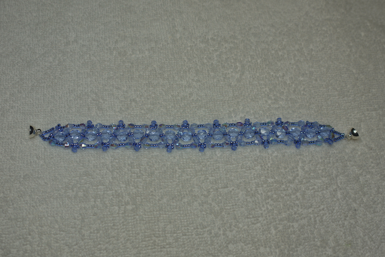 Geregen met rocailles en diverse glazen facetkralen. Met zilverkleurig magnetisch slotje. (niet geschikt voor mensen met een pacemaker!)