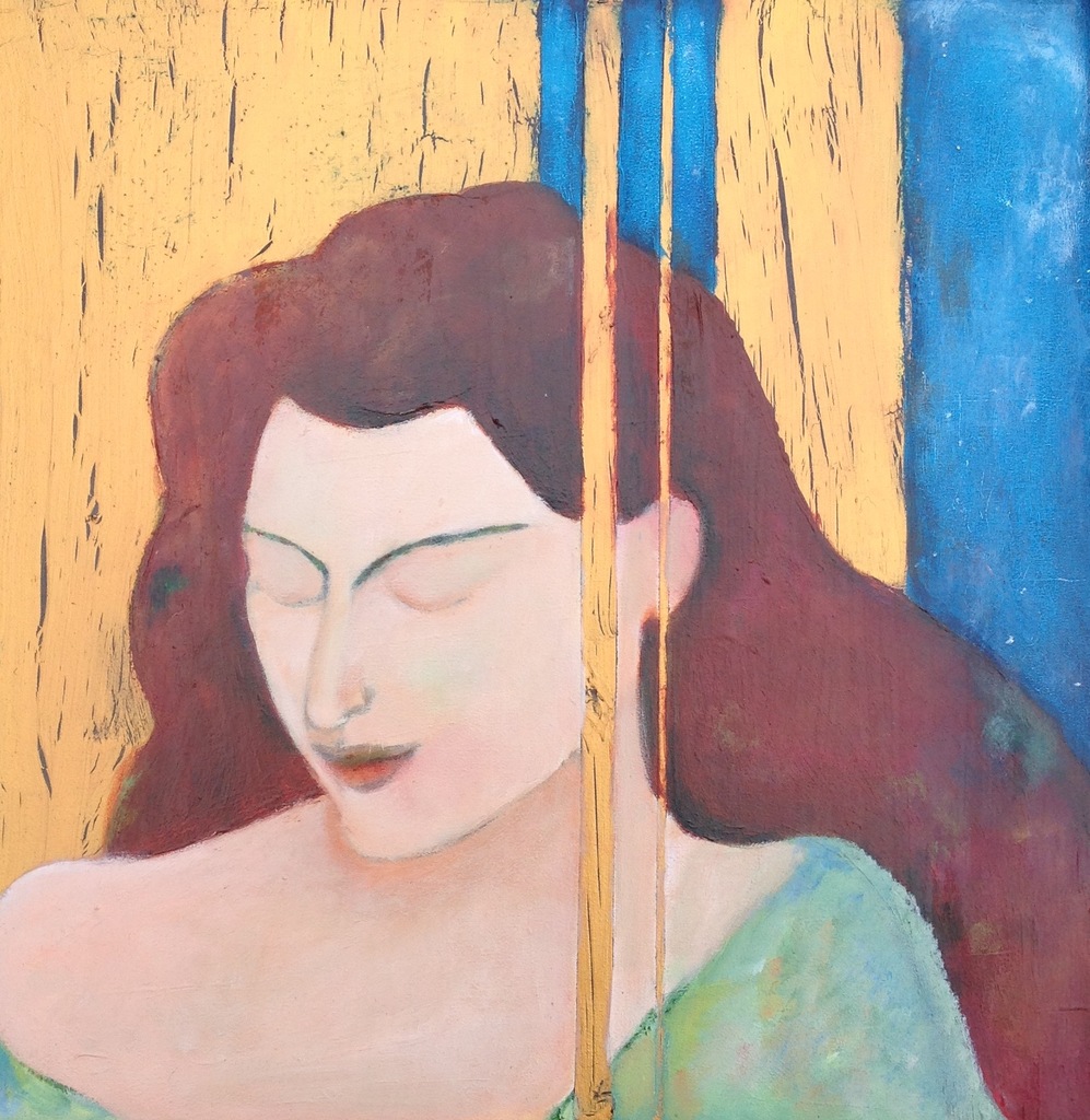 Vrouwenfiguur in acryl op paneel, onderdeel van een tweeluik. Samen in een lijst van een raamkozijn van meer dan 100 jaar oud (zie twee vrouwen I)