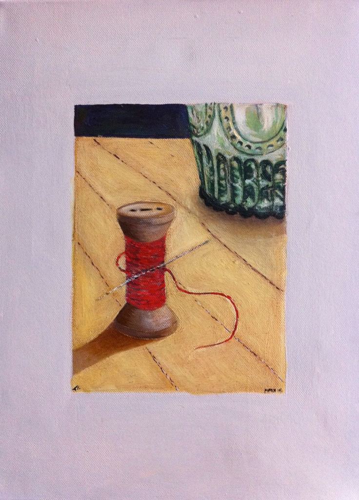 de weefster, een miniatuur in een geschilderd (zeer zacht rose) kader waardoor een klassieker en dieper effect ontstaat. Het kader is een bewust onderdeel van de compositie en geen paspartoe.