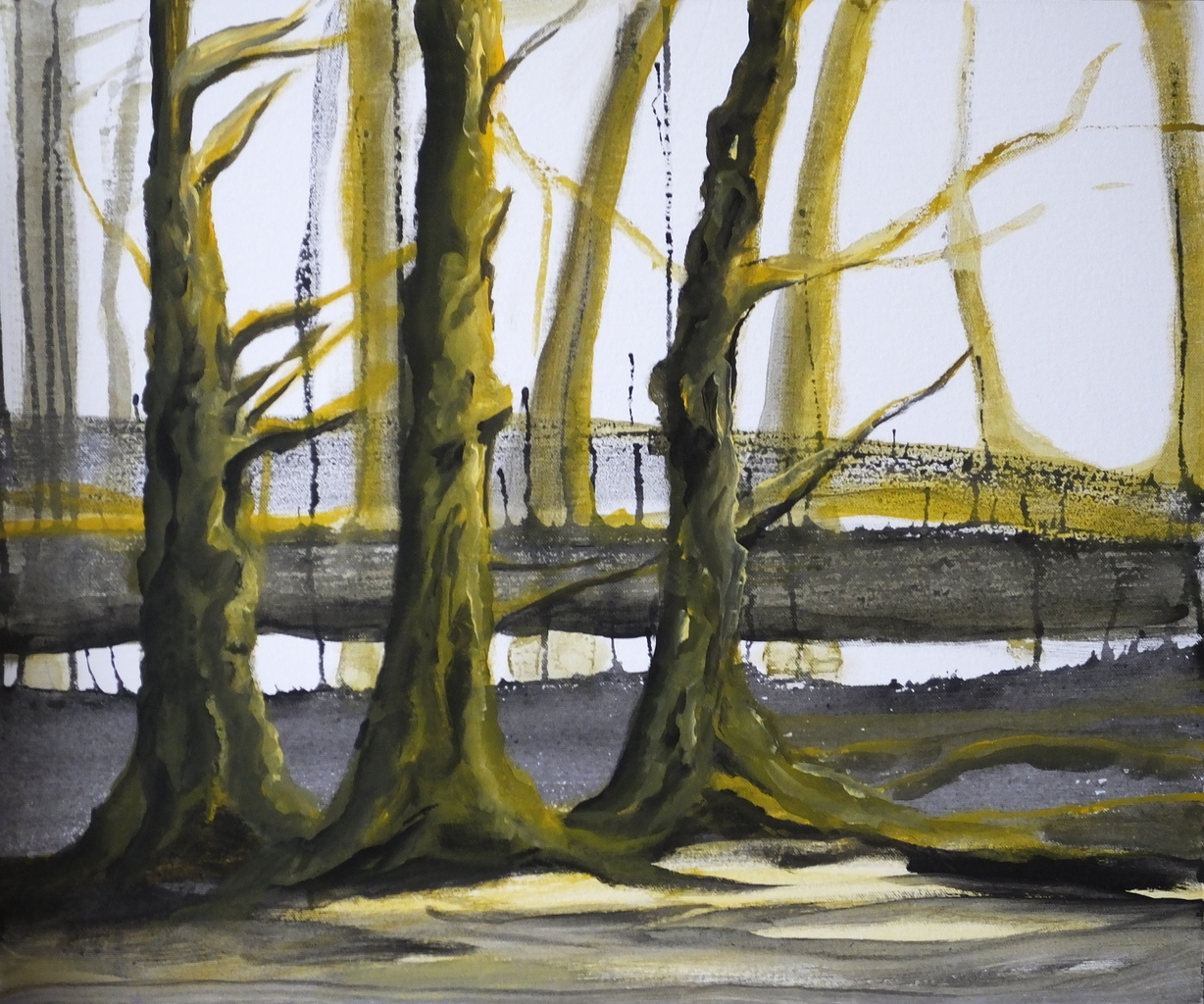 Bomen op hardboard (50x60cm) op donkergroen hardhouten paneel (63x88cm).