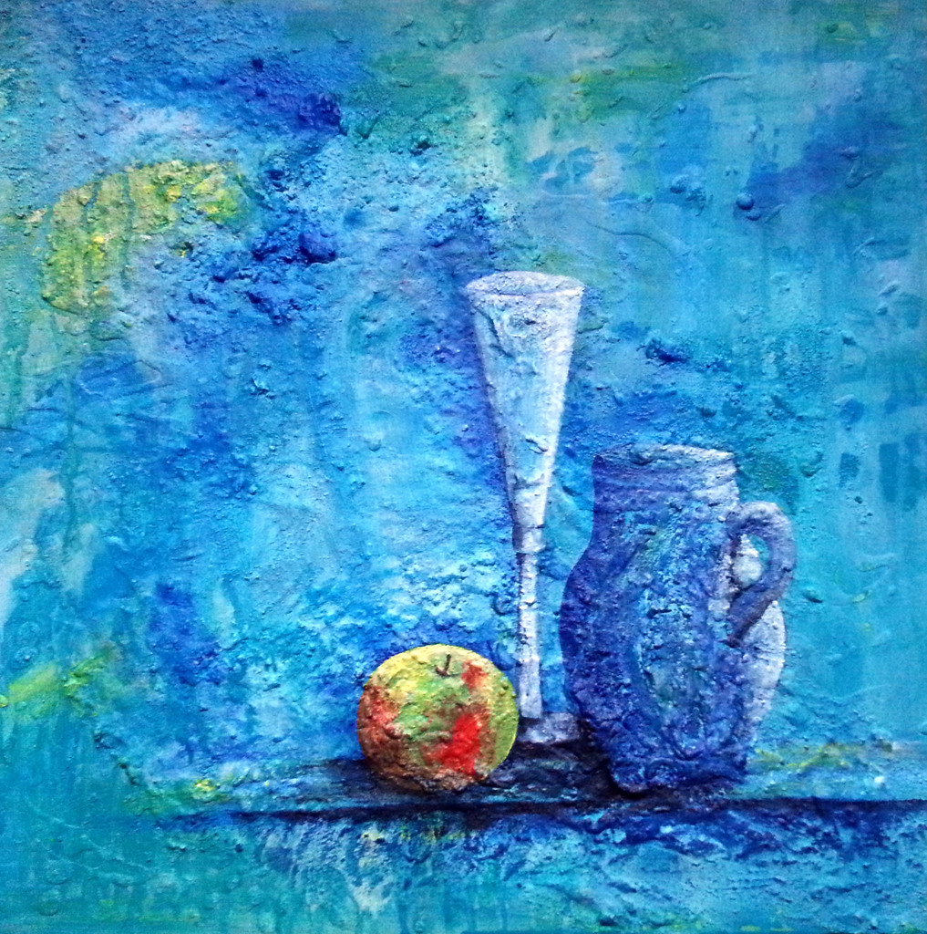 Schilderij gemaakt met verschillende materialen, in voornamelijk blauw-groene tinten.