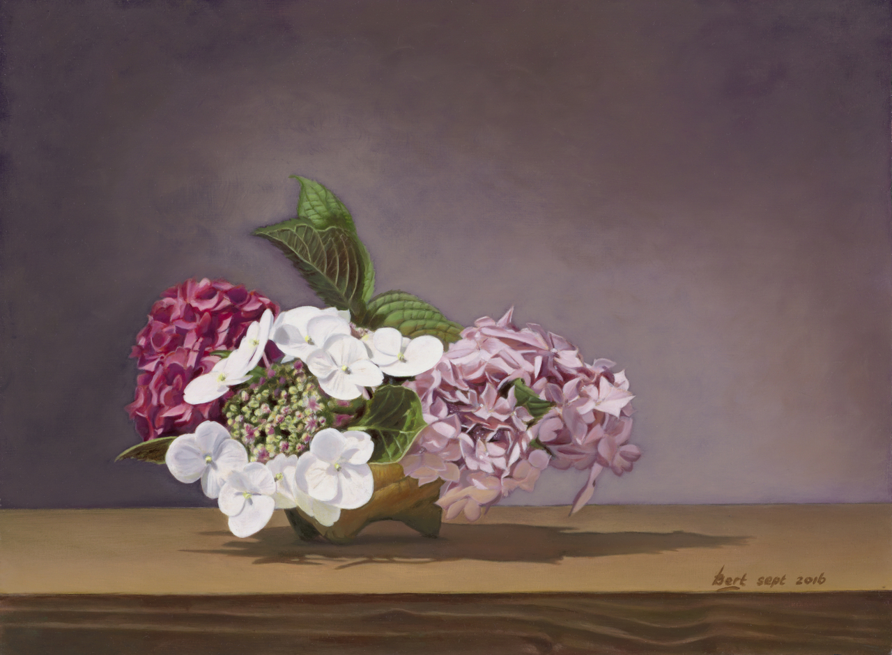 Met deze hortensia's ben ik tijdens mijn zomervakantie in Rovinj Kroatië begonnen. Geïnspireered door de Kroatische fijnschilder Zoto die vlak naast mij zijn studio had.
