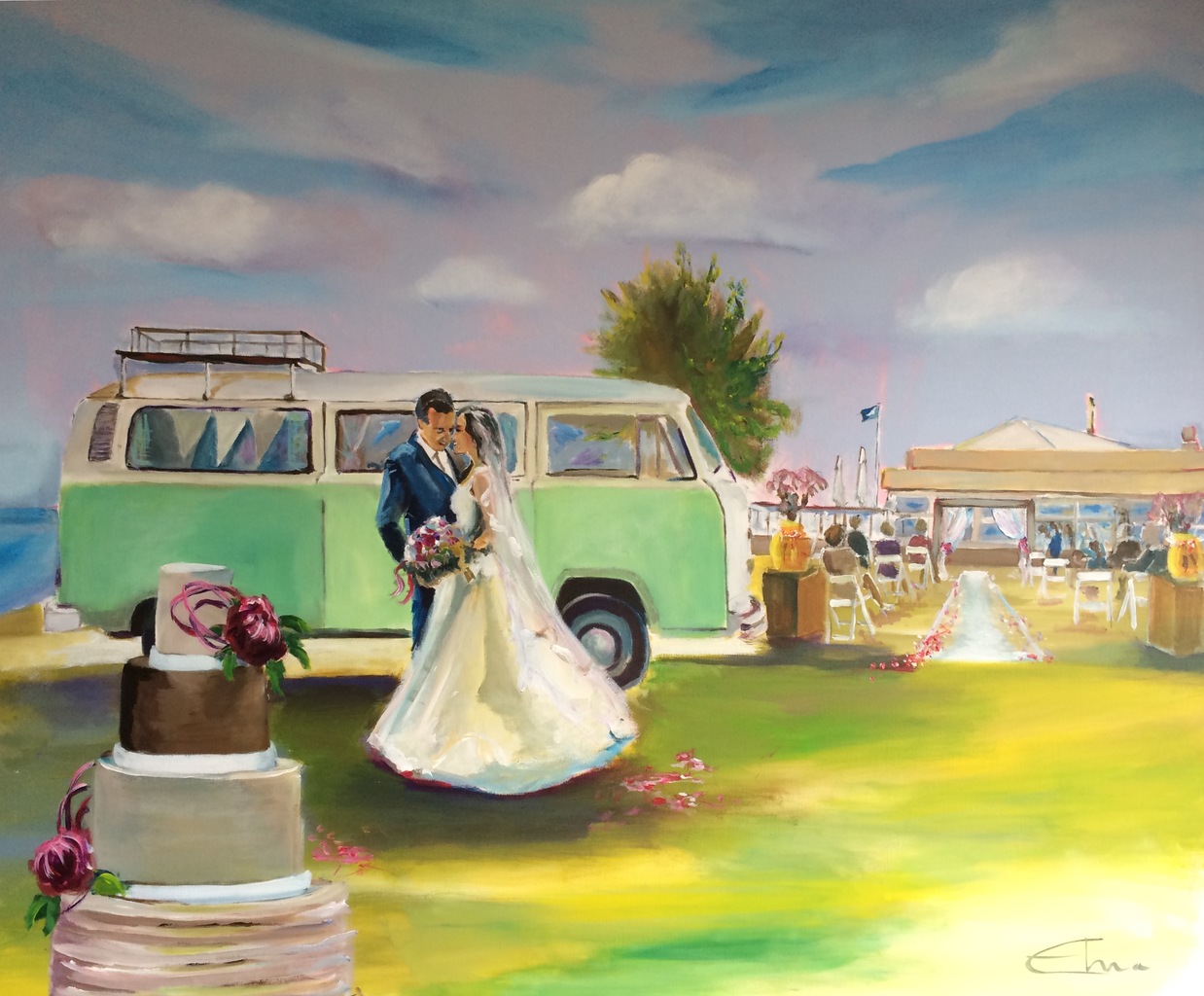 Live Paint Trouwbeleving Bruinisse Paviljoen Meerzicht Bruidspaar Volkswagen Busje Prieel Bruidstaart Acryl Schilderij Demonstratie Trouwbeurs