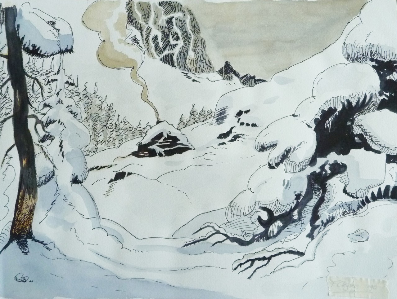 Schets van een berghut in de sneeuw in aquarel en met inktpen.