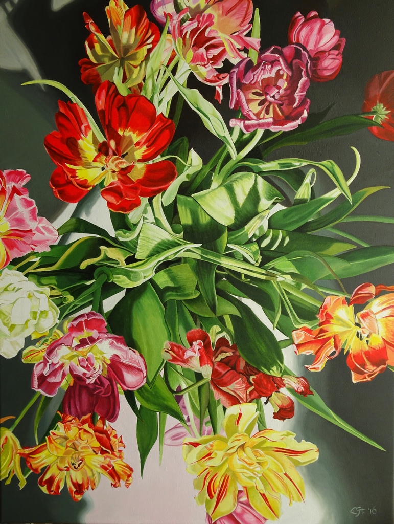 Boeket Uitgebloeide Tulpen Veelkleurig Rood Geel Roze Paars Groen Olieverf Realistisch