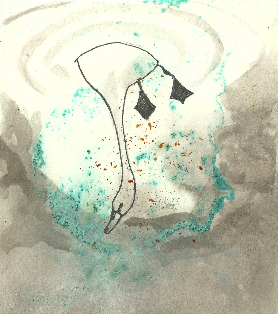 Zwaan onder water, getekend met inkt, roest en geoxideerd koper