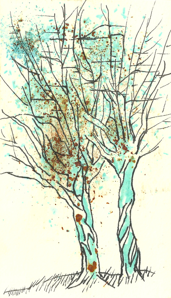 Bomen, getekend met inkt, roest en geoxideerd koper.