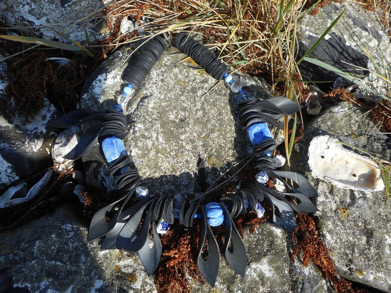 Rubber ketting met keramiek kralen in blauw.
