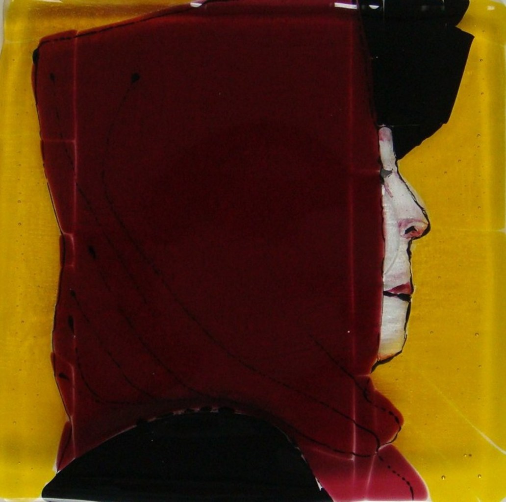 Glazen schaaltje met beeltenis van koningin Beatrix op staatsbezoek, nr 1 uit serie van 4. Glasfusing en gebrandschilderd.