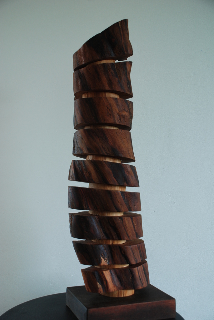 Het natuurlijke levendige van hout is voor mij de uitdaging. Het liefst werk ik "en taille directe". Zoeken in het hout. Hoe om te gaan met de kwasten? Hoe mee te gaan met de jaarringen? Opgenomen worden in die spelingen van de natuur. Dan een harmonieuze intrigerende sculptuur te maken. Met alles wat er door de natuur al in gebakken was.