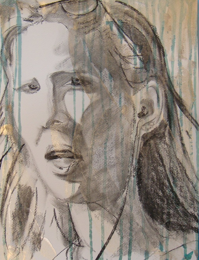 Portret van pratende vrouw op straat. Acryl met houtskool en bister op papier.