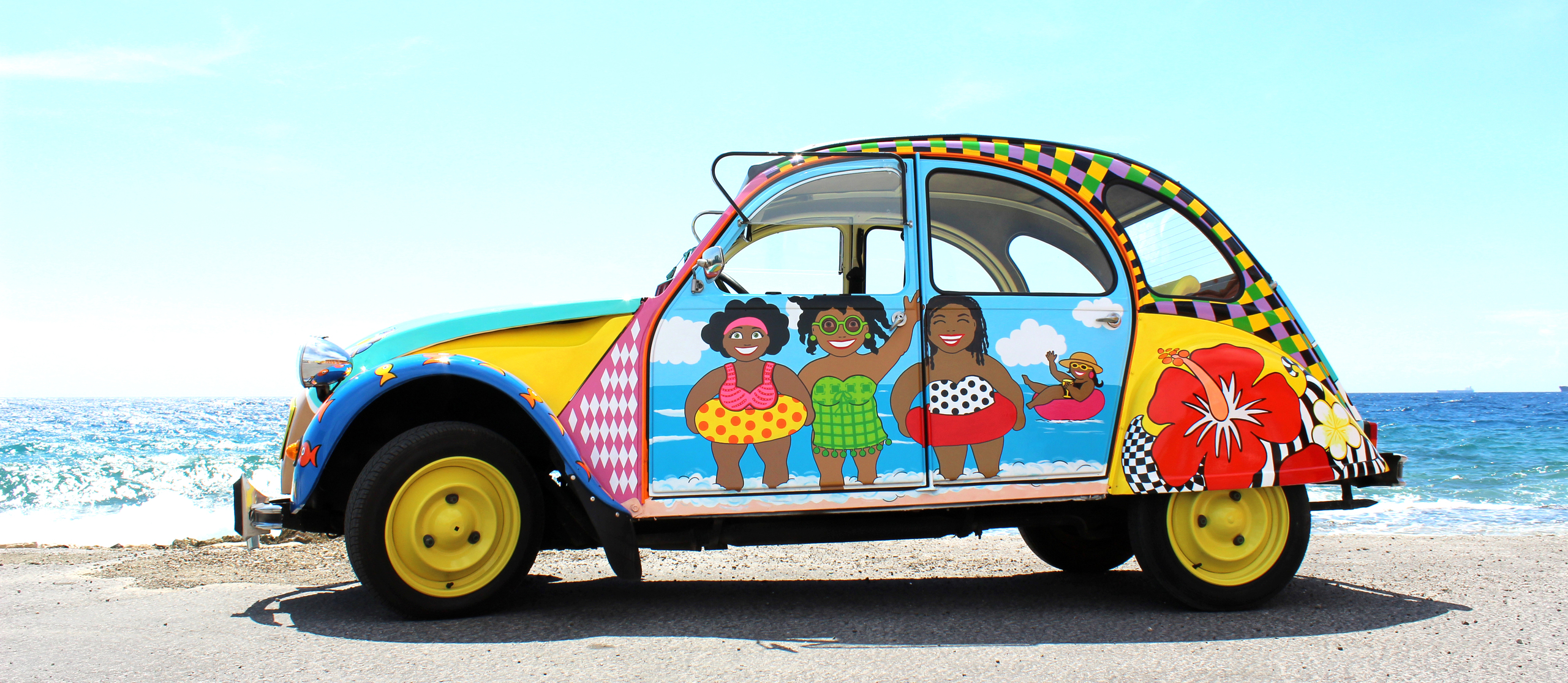 Geschilderde lelijke eend (citroën) in Curacao, vrolijk en kleurrijk het eiland bekijken, dat is helemaal in stijl, ook omdat de huisjes er allemaal gekleurd zijn. Zie je het al voor je met deze leuke auto te rijden over de Handelskade in Punda?